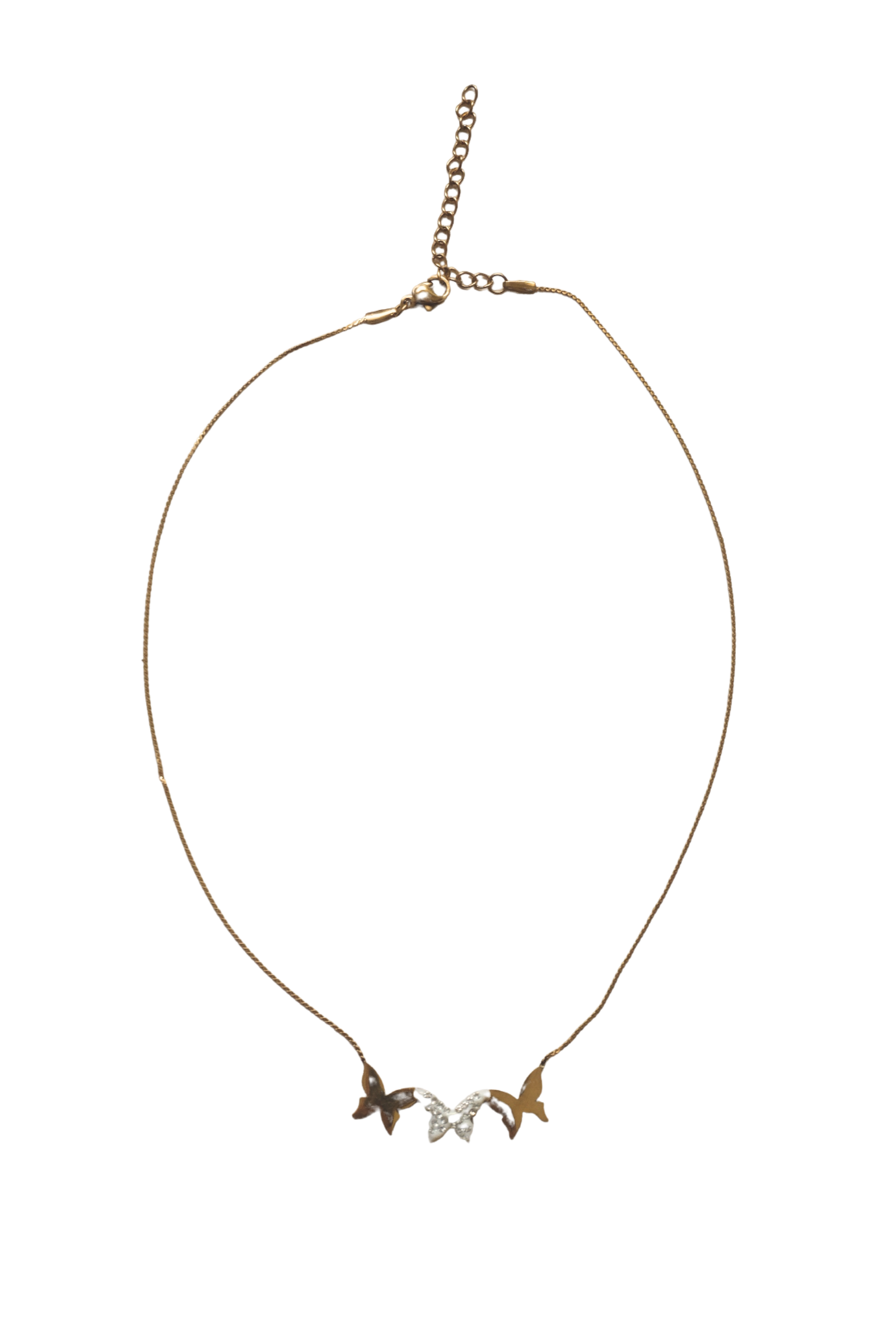 Delicate stainless steel necklace with luxurious gold plating, featuring a charming trio of butterfly charms. The centerpiece showcases a stunning white enamel butterfly adorned with crystal clear stones, flanked by two complementary butterfly designs. The fine, graceful chain measures 40cm with an additional 5cm extension, allowing for a customizable fit. Perfect for layering or wearing solo, this elegant piece adds a whimsical touch to any jewelry collection.