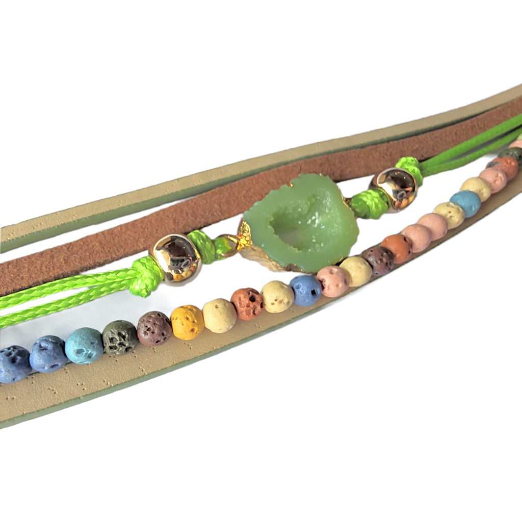 Elegant leather bracelet featuring a stunning green imitation stone centerpiece with layered light and dark green shades. The secure magnetic lock ensures effortless fastening and all-day comfort. Perfect for adding a touch of natural sophistication to any outfit.