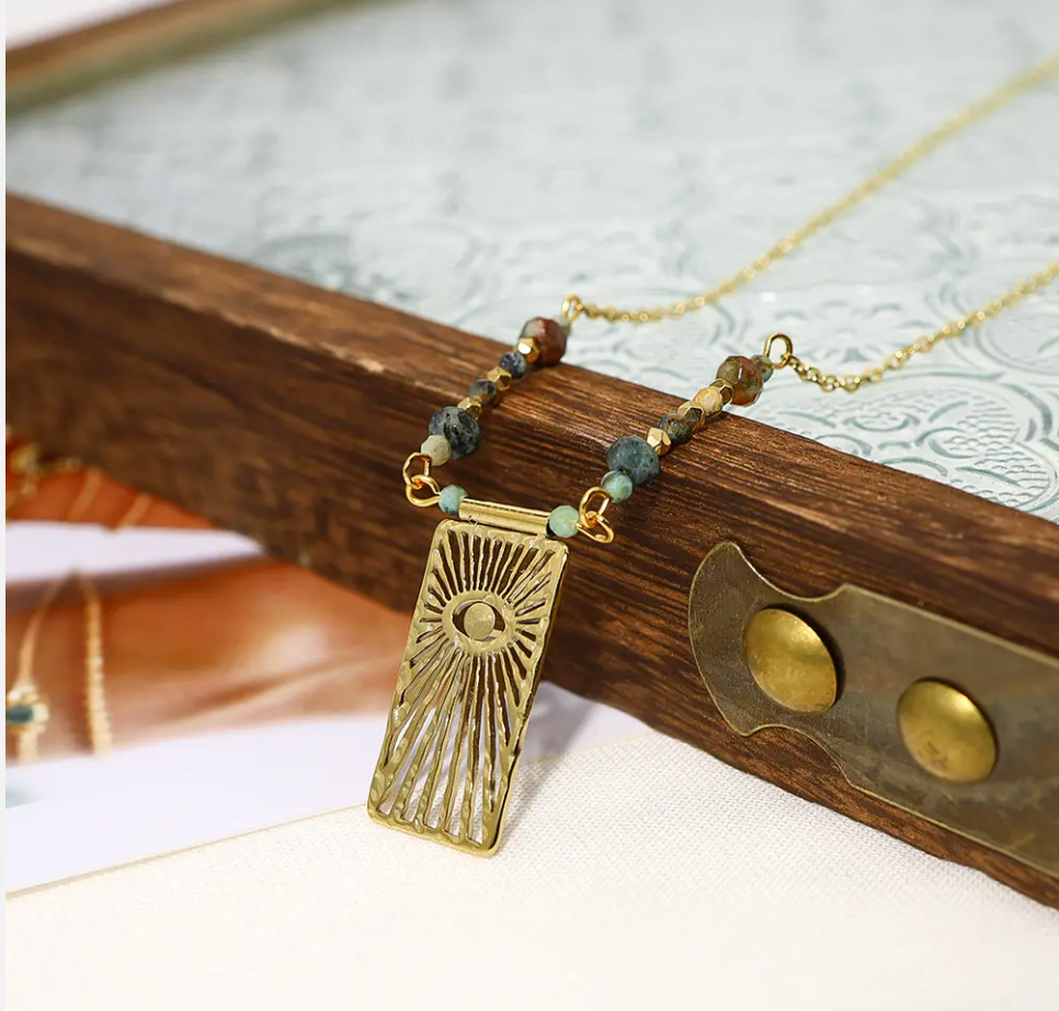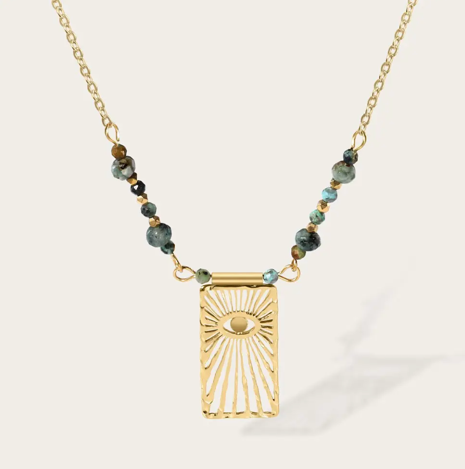 This Greek Necklace features a stainless steel chain with elegant gold plating, complemented by a natural green stone Evil's Eye charm. Measuring 42 cm with an additional 6 cm extension, it offers adjustable comfort and a timeless design that combines durability with meaningful symbolism. Ideal for those seeking both style and protection in one refined accessory.